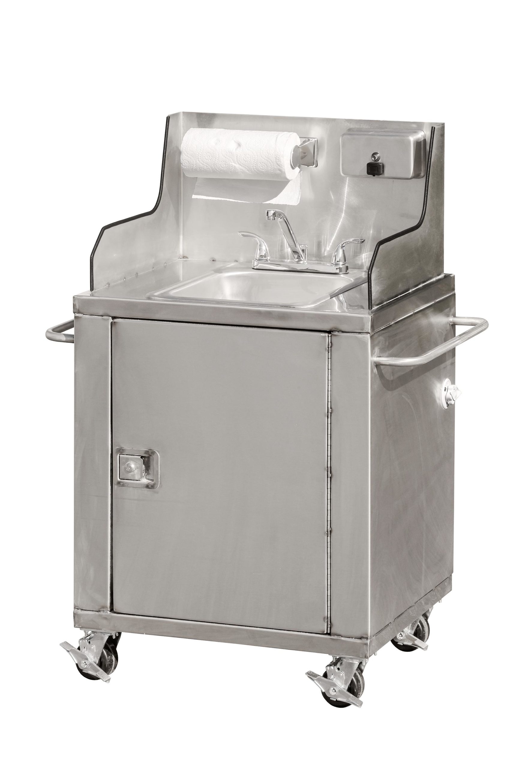 This hand wash sink is made from food-grade T304 stainless steel. It holds 11 gallons of fresh water and 15 gallons of grey water.