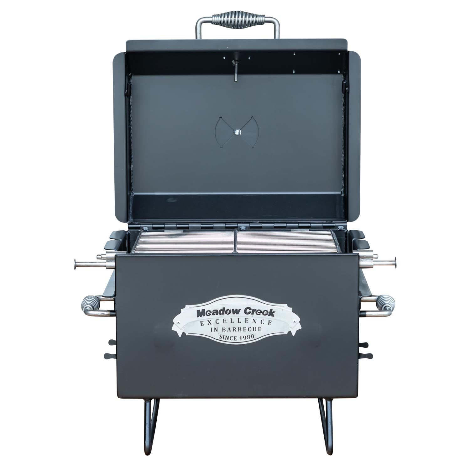 This is the smallest of our charcoal grills with rotating grates and comes with a lid and a charcoal pan, which can be raised for a more intense fire for grilling steaks and burgers.