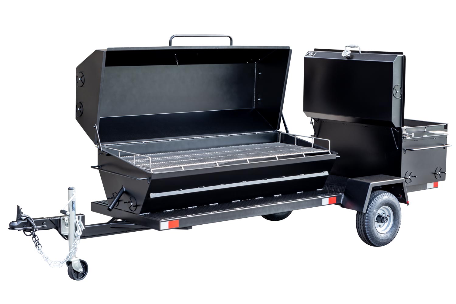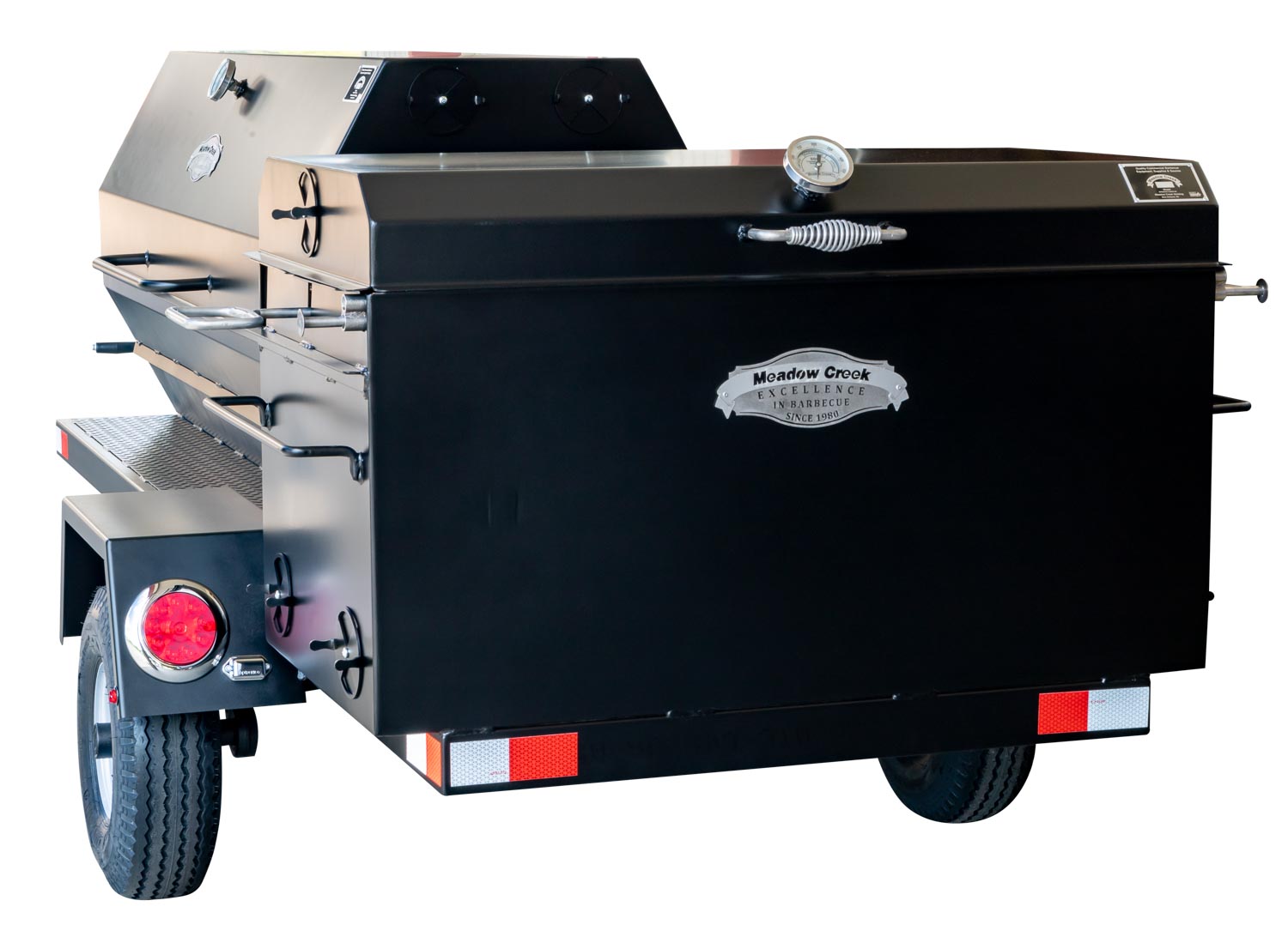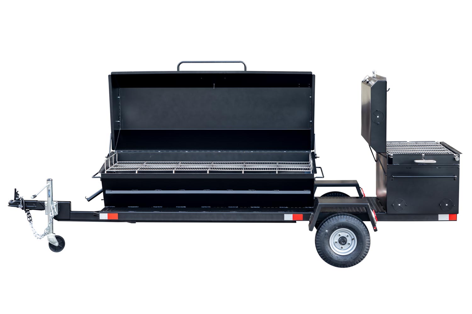 This unit is charcoal/wood-fired and features the PR72 Pig Roaster. The standard layout has the BBQ42 in the back facing the rear of the trailer. Add 10% to the base price for alternate layouts, such as BBQ42 and Pig Roaster in parallel.