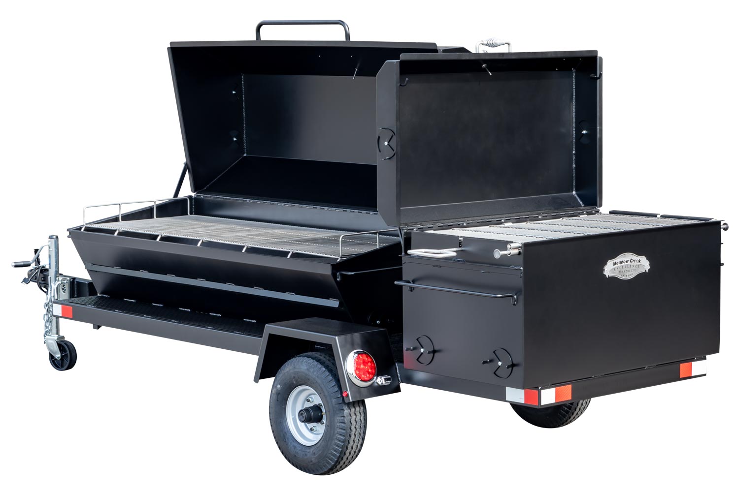 The Caterer’s Delight trailer has a mounted Pig Roaster and a BBQ42 Chicken Cooker. The pig cooker is perfect for smoking whole hogs, brisket, pork butts, and more. The BBQ42 Chicken Cooker with double-sided grates makes cooking chicken for a crowd fun and easy! Raise the fire with a charcoal pan insert for steaks, hamburgers, and other grilled food.