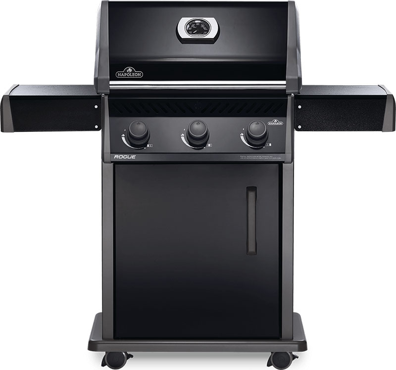 Napoleon’s Rogue® 425 Propane Gas Grill in black, is a premium quality gas grill with an affordable price. Three burners light every time with a battery-free ignition. This grill boasts precise temperature control, high heat searing over cast iron cooking grids and stainless steel sear plates for even heating and to keep your grill clean. The stylish black exterior is highly durable and easy to clean.